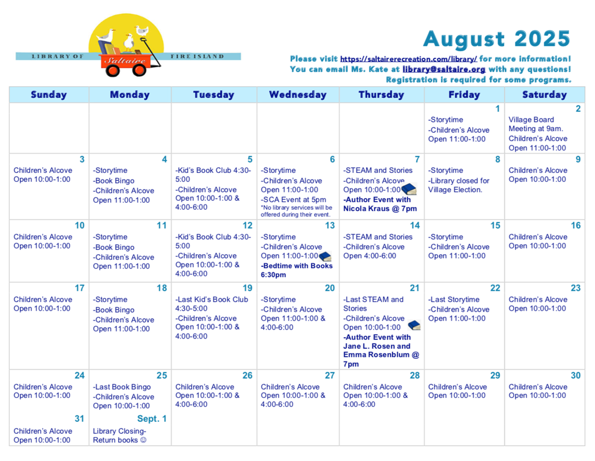 The Saltaire Library is happy to offer a wide range of services to our community! We invite you to come “check out” our adult and children book selections, as well as our work spaces for teens/adults and play space for children. The main room of the library is open most days from 8am-8pm, however, there can be some changes to our schedule so please check the library calendar or our social media accounts for the most up to date information. The Children’s Alcove has specified hours that can also be found on the calendar. We offer weekly programs for children in July and August. Read below to find out more and to register. If you have any questions, please contact Ms. Kate by emailing her at library@saltaire.org.